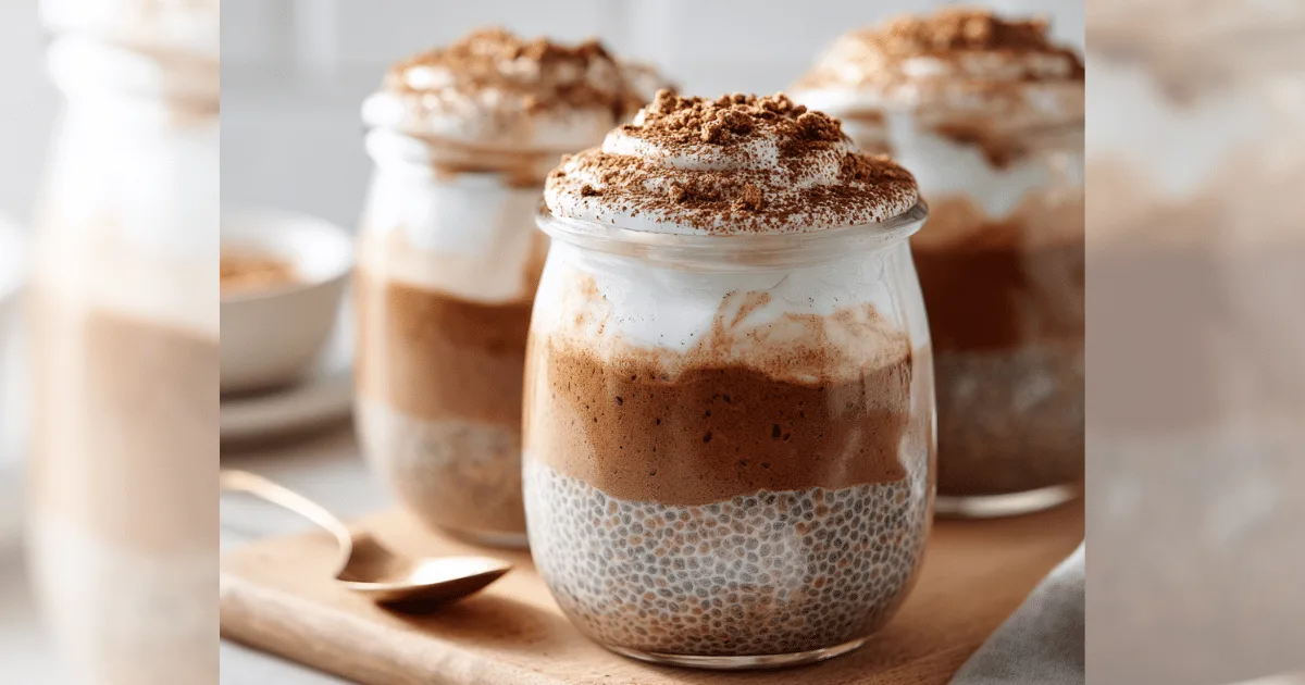The base comes together in minutes: blend ¾ cup milk, ¾ cup Greek yogurt, 2 tablespoons maple syrup, ¼ cup espresso, ⅓ cup chia seeds, 4 teaspoons cocoa (or tablespoons of rich chocolate protein powder and just a pinch of salt, then blend until the mixture turns irresistibly smooth and velvety. Divide into jars and add a sprinkle of crushed graham crackers for that familiar “ladyfinger” crunch. It comes together in minutes, tastes deeply satisfying, and truthfully puts store-bought treats to shame.